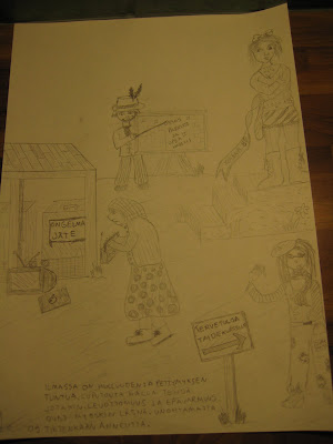 Tänään tuli sitten valmiiksi tila tehtävä joka onnistui suhteellisen hyvin. Tussit eivät välttämättä kuitenkaan ole parasystäväni tulevaisuudessa. Tehtävässä piti siis hakea lehdestä kuva jostakin tilasta ja piirtää se kuultopaperille. Tämän jälkeen kuultopaperi käännettiin ja sen toinen puoli väritettiin. Kun tusseilla väritys oli valmis käännettiin kuva jälleen ja ei tussattu puoli väritettiin puuväreillä. Näin kuvaan saatiin lisää elävyyttä ja eri värejä voitiin vielä vahvistaa. Sitten liimattiin kuultopaperi eriväriseen aluspaperiin ja reunat leikattiin siisteiksi.